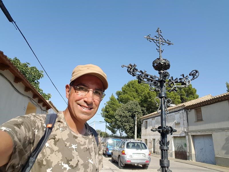 Si seguimos avanzando llegamos a un grupo de casas. Junto a una, en el lado izquierdo según marchamos, se eleva una cruz de hierro de forja. Una señal indica por donde se va al vedado. Pasadas las edificaciones, seguimos por una carretera asfaltada. A lo lejos se ven unas naves con las paredes pintadas en color granate.