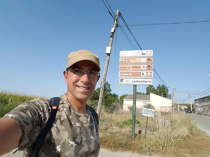 Sigo marchando por la pista que está rodeada de campos,pero a cada lado de la misma hay una hilera de pinos. El tamaño me indica que tienen ya unos cuantos años. Seguro que los días de sol protegen al caminante de los rigores del astro rey. Ahora está nublado, lo que supone un alivio para mí. La temperatura es agradable a pesar del calor de julio.