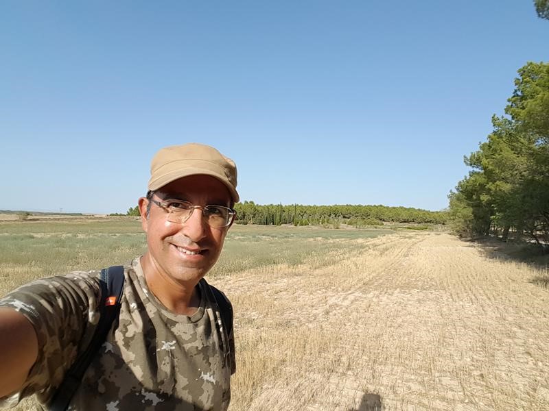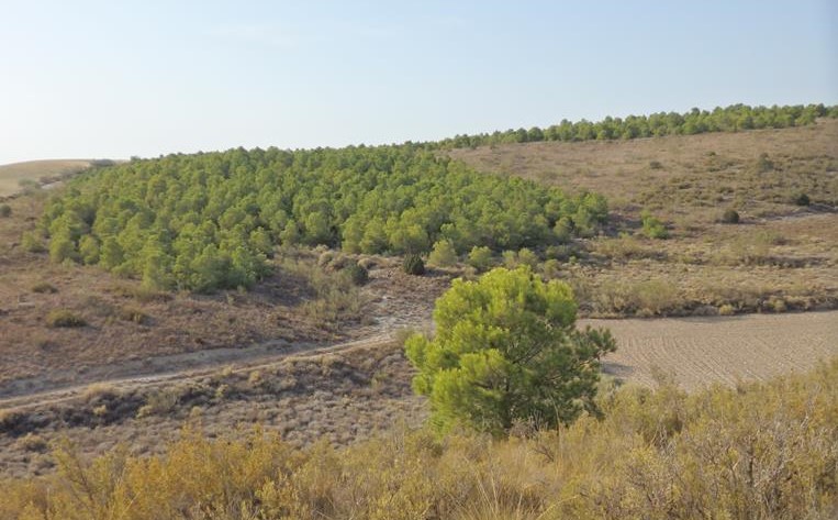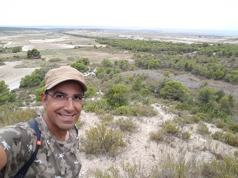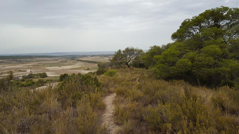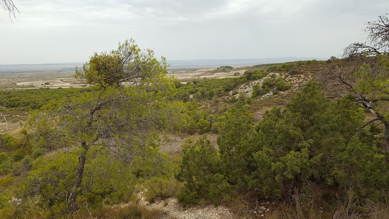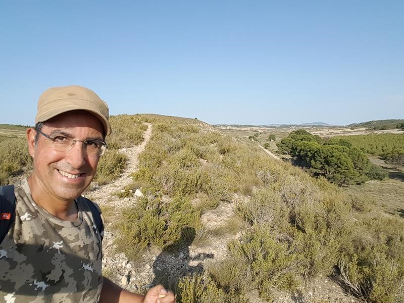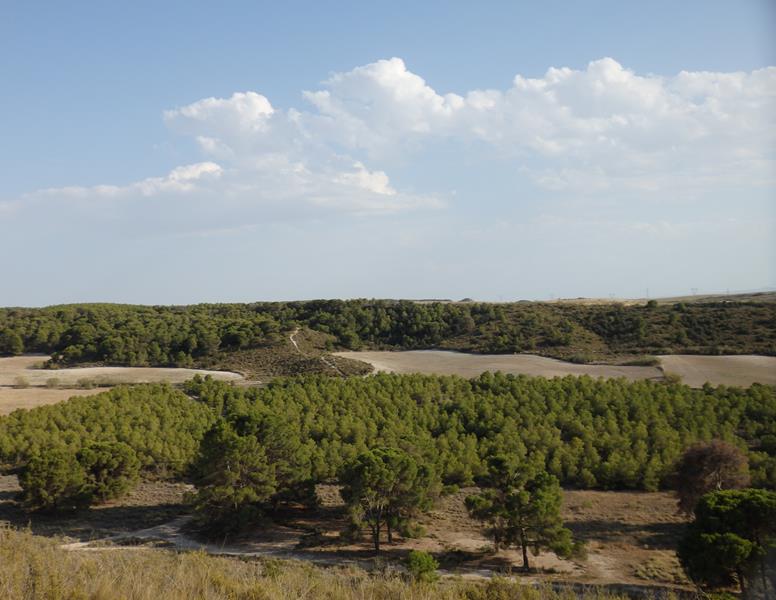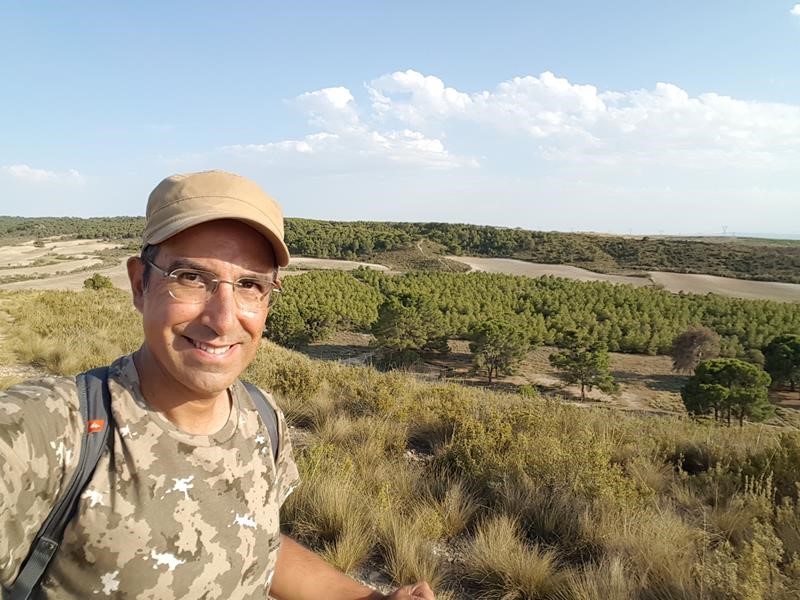 Mientras subo la loma,vuelvo a encontrarme con el matorral propio de la zona esteparia, con abundante tomillo, que conozco bien. Sin embargo, el objetivo de otear el horizonte y ver si tengo al alcance el vedado, da sus frutos. Me doy cuenta de que todavía no he llegado ni a lo que se considera propiamente la zona boscosa, aunque sí que veo extensas masas de pinar junto a los «vales».