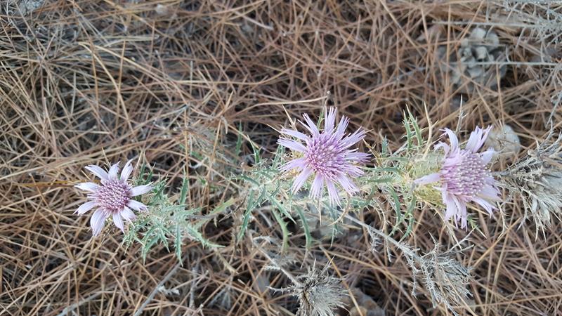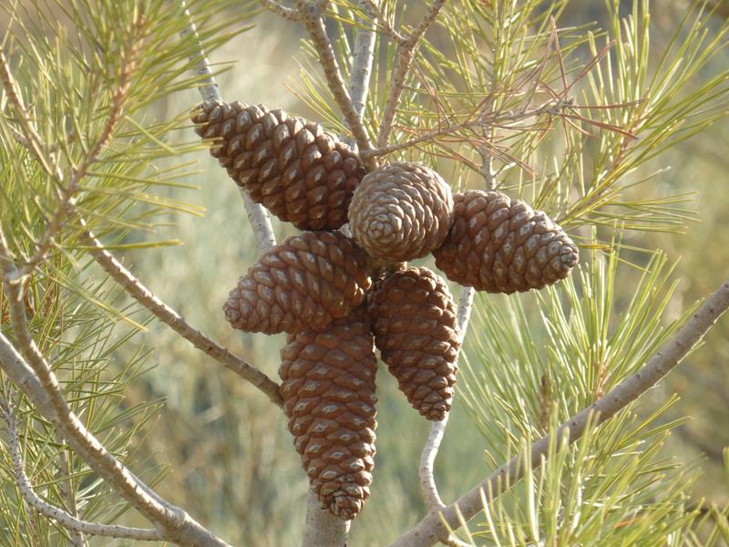 En mi recorrido no he visto flores apenas. Si acaso , ya medio marchita, la de algún cardo entre la hierba seca. Toca regresar. No quiero perder el autobús. Por el camino me llama la atención un racimo de piñas naciendo de un mismo punto.