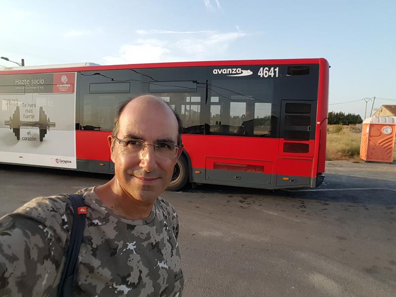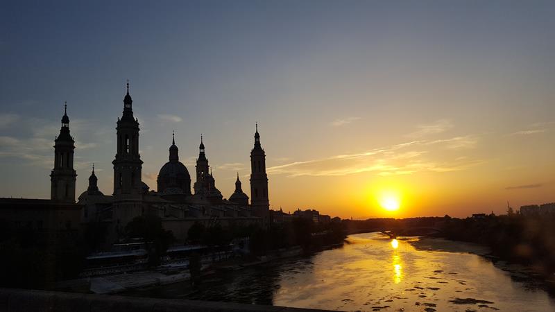 Son las 20:33. El autobús circula ya por Zaragoza, por encima de uno de los puentes que cruza el Ebro, y a través de la ventana del autocar puedo ver el sol poniéndose y reflejando su luz en las aguas del río, mientras el perfil de la Basílica del Pilar se recorta a un lado. Una bella estampa para despedir el día.