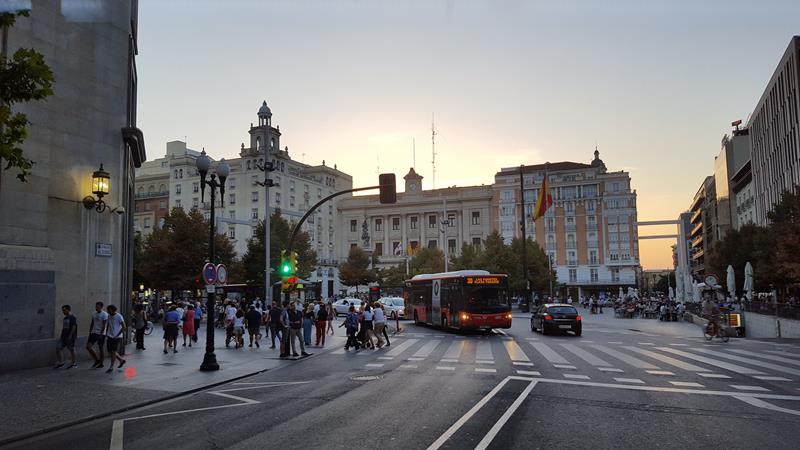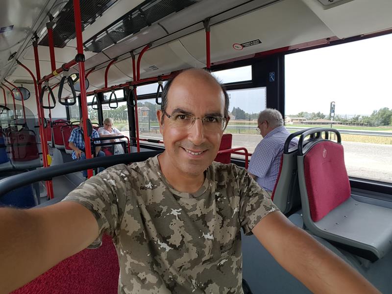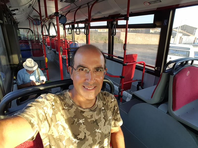Para trayectos tan cortos, mi elección es el transporte público siempre que esté disponible.Serán como las 16:30 horas de la tarde cuando desde mi casa cojo el tranvía que me lleva a la Plaza de España de mi ciudad, donde me bajo. Después tengo que montarme en el autobús urbano. Peñaflor es un barrio rural, así que por tanto los autobuses son los de la ciudad.