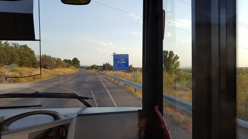 A veces vamos más despacio, el autobús se ve obligado a frenar, el motivo son unos badenes colocados a idea para que los vehículos tengan que reducir la velocidad al atravesar la población. De momento no he dejado de ver casas y campos a ambos lados de la carretera.