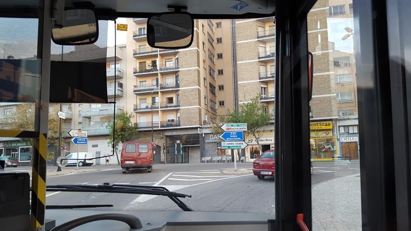 Un minuto después de cruzar el puente, el autobús ya está girando a la izquierda y dirigiéndose hacia Montañana, veo a mi izquierda, como antes os decía, el edificio de la fábrica de Balay. El autobús luego pasa por el puente que cruza la AP.2.