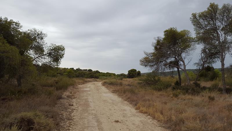 Ya empiezo a observar los primeros pinos carrascos de buen tamaño. Lo que sí comienzo a apreciar es que el cielo cada vez se esta enturbiando más. Igual llueve. AEMET ha anunciado posibilidad de que ocurra esto hacia la última hora de la tarde. Pero para entonces yo ya confío en estar de vuelta.