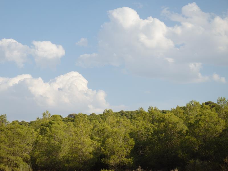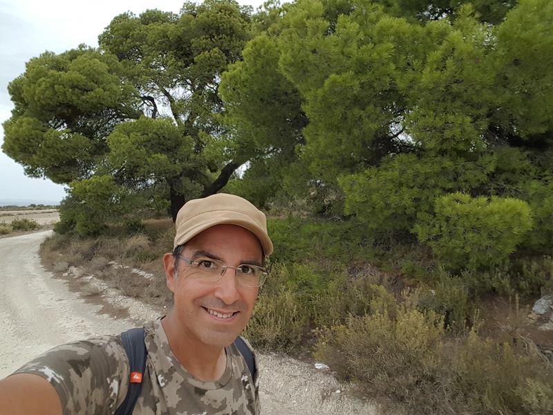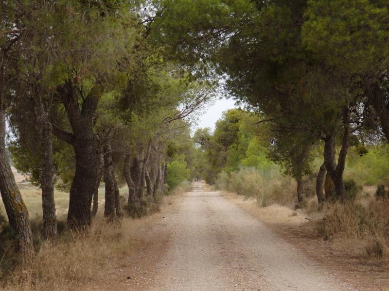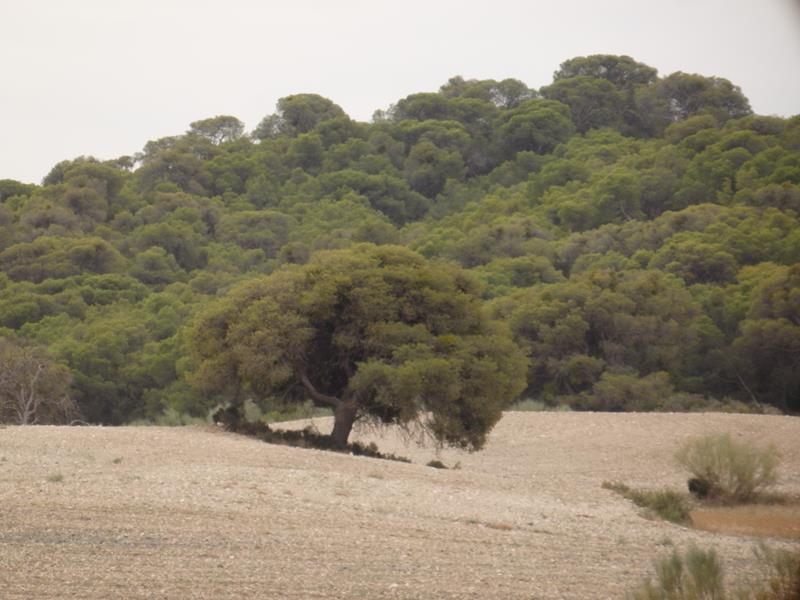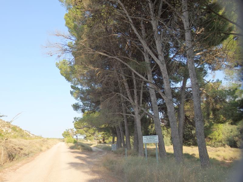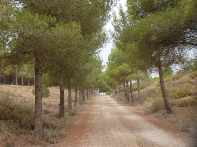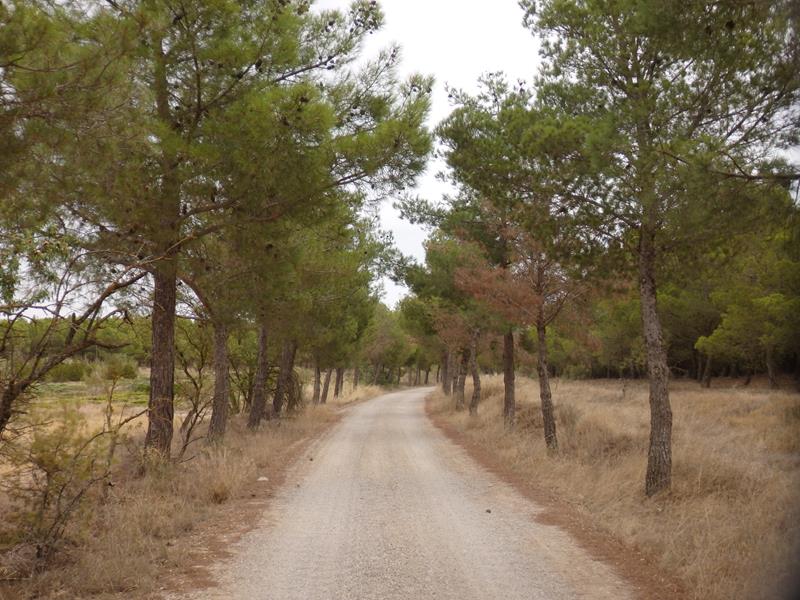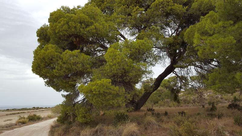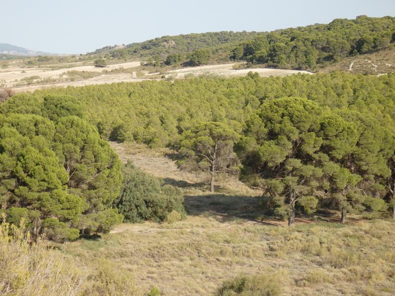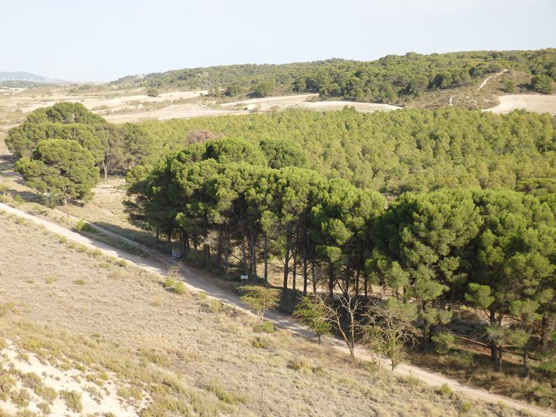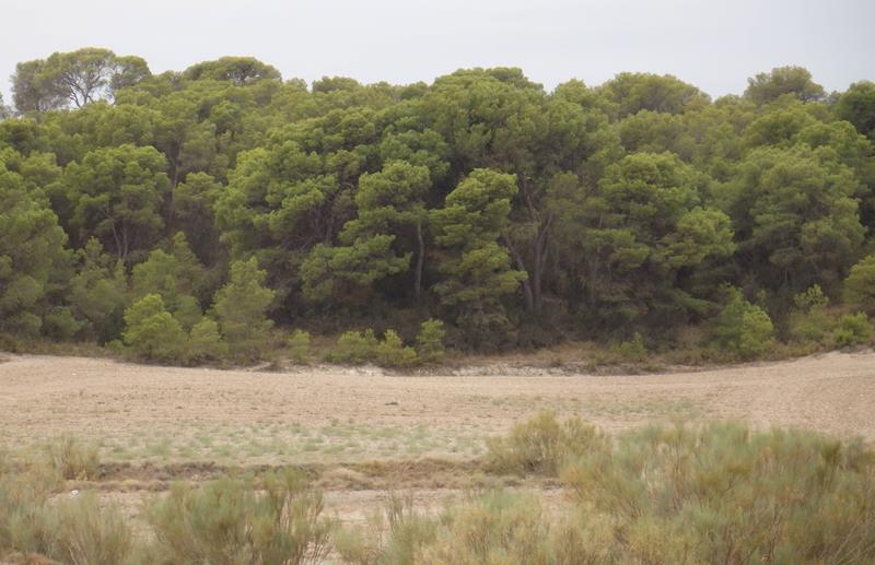Por echar un vistazo a ver que hay más allá, me salgo un poco del camino y subo una pequeña loma, para comprobar que frente a mí se extiende un bosquecillo bastante tupido de pino carrasco La sensación de ausencia de sonidos que noté al bajar del autobús, aquí aún es mayor.