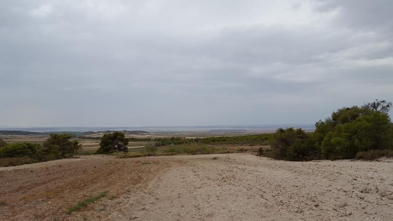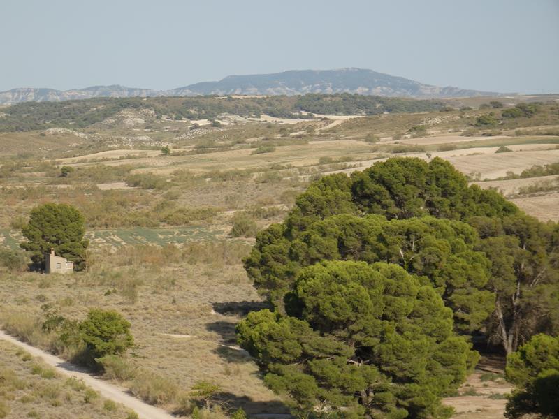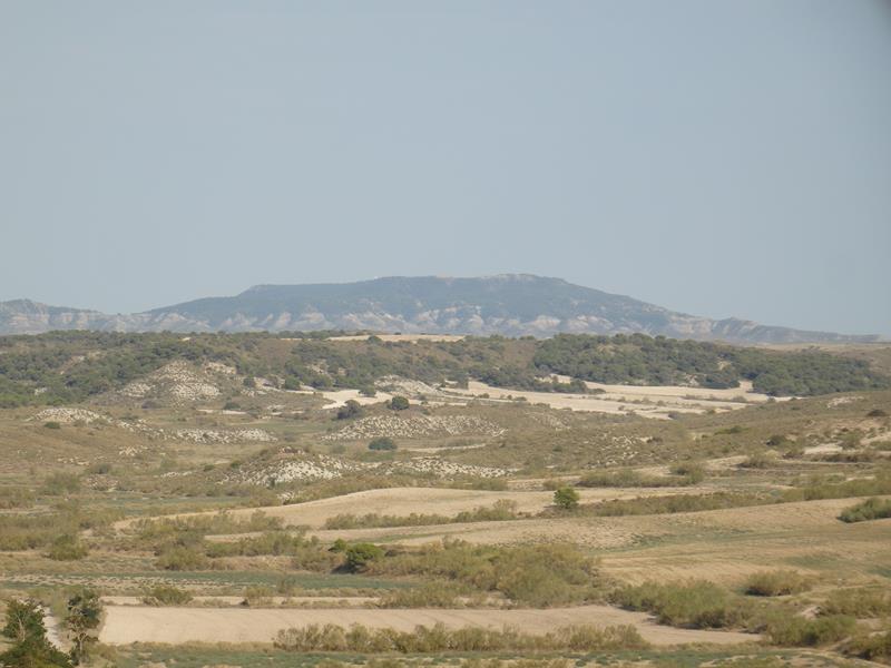 También puedo observar la sierra de Alcubierre a lo lejos, al noreste.En un segundo horizonte, aunque brumoso, se puede ver la Muela, al suroeste, la Plana de Zaragoza al sur, y los montes de Zuera al oeste.