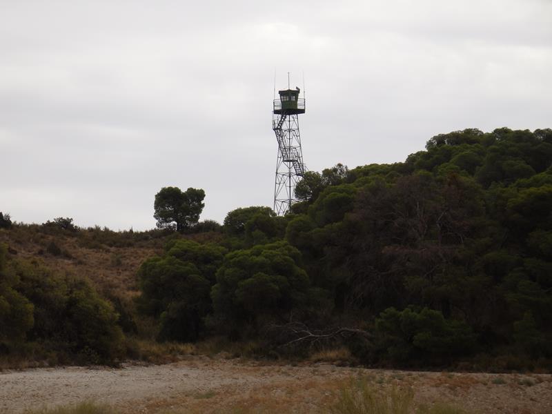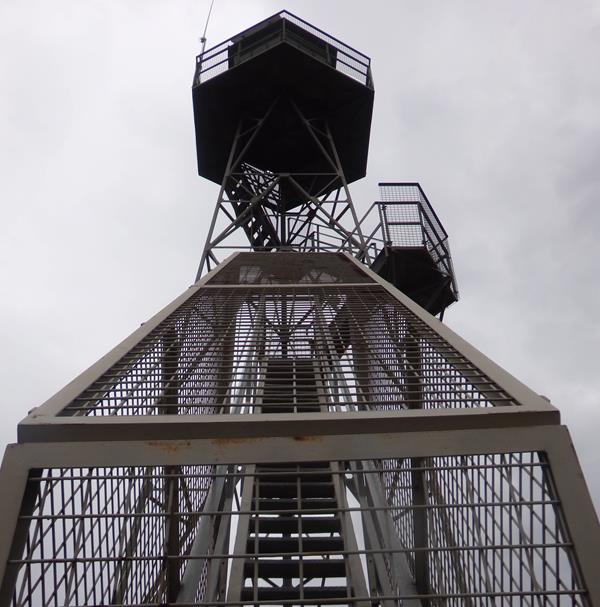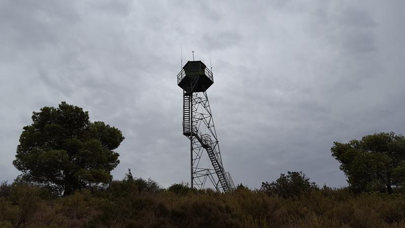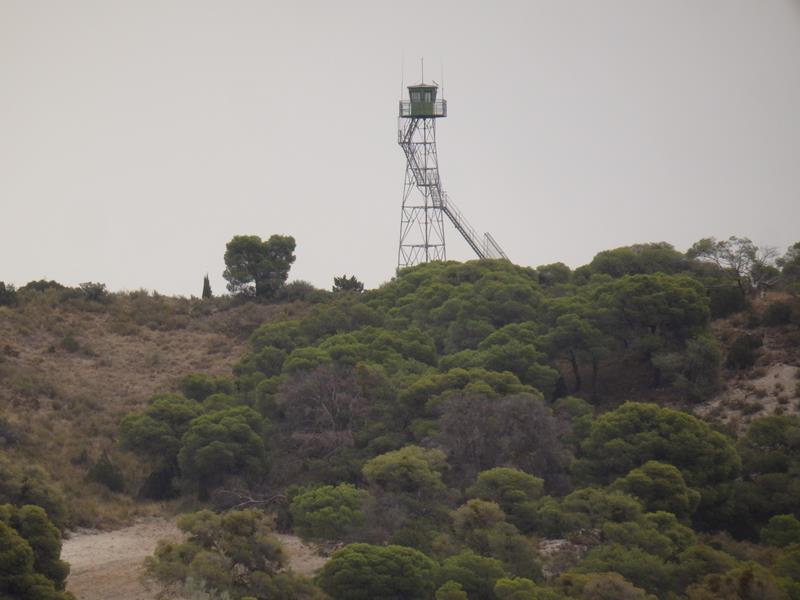 Ahora le toca a la torreta de vigilancia forestal. Sería genial poder subir hasta allí arriba. Las vistas serían magníficas. Pero mi gozo en un pozo. Hay una verja que impide el acceso. Será por seguridad. Tampoco creo que venga mucha gente por aquí, pero seguro que si se pudiera, algún gamberro dejaría su pintada a modo de firma arriba. Mejor así.