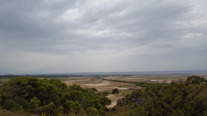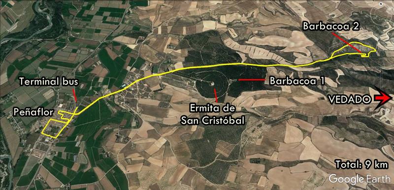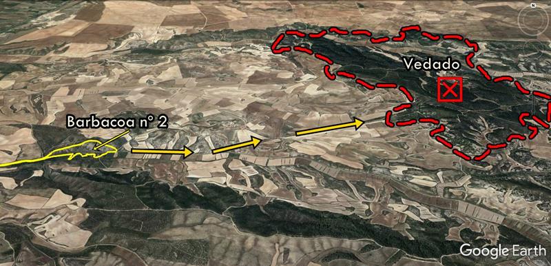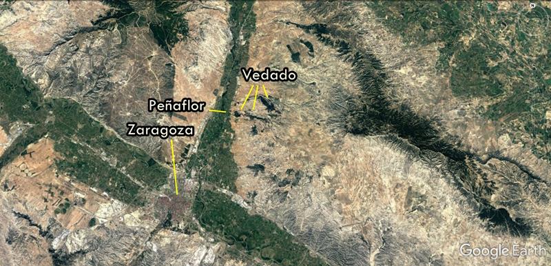 Como también podéis apreciar, se ven unas manchas verdes rodeadas de marrón y que he señalado como Vedado. Ahí está. Una isla en medio de las estepas y llanuras semiáridas del entorno, propio de la zona central de la depresión del Ebro,que es donde nos encontramos. En la entrada del blog «Caminata por la estepa zaragozana» os explico por qué de este clima tan seco. Tiene que ver con el implacable efecto Foenh.