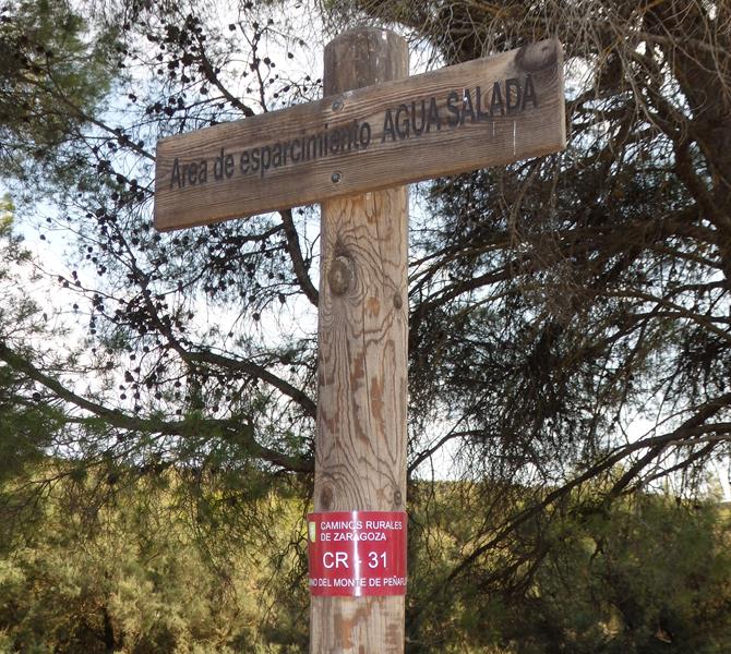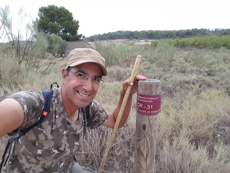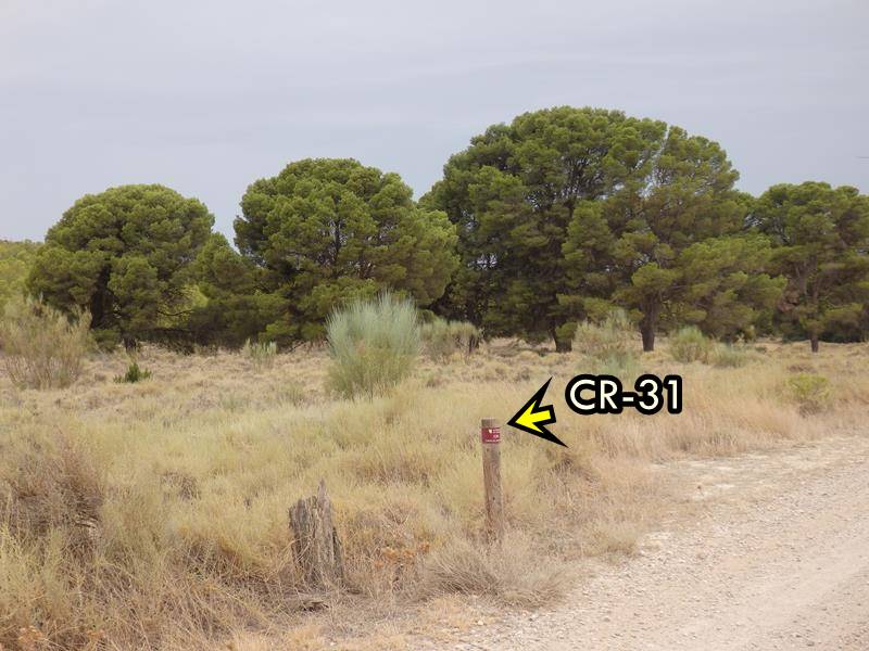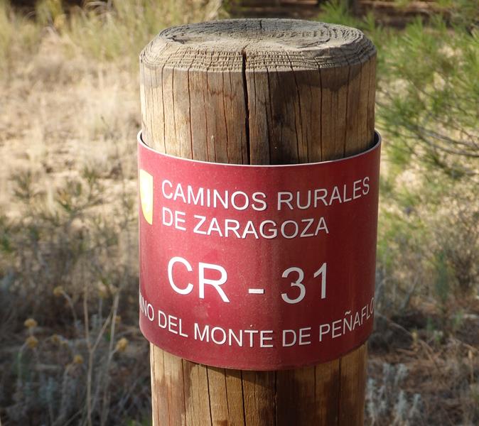 Vuelvo a retomar la pista, y a un lado, me encuentro con un poste en el que han clavado una placa metálica de color rojizo que indica que voy por el CR-31, esto es, por los caminos rurales de Zaragoza, en este caso el que corresponde al monte de Peñaflor. Hay que seguir esta ruta.