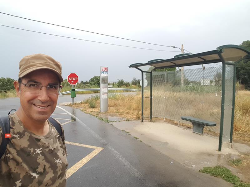 A las 19:55 horas ya estoy en la parada esperando el autobús. Sale a las 20 horas. Hay junto a la parada una caseta prefabricada que sirve para alivio de los conductores. Descubro un avispero en una de sus paredes. Cuando llega el autobús se lo comento al chófer, que da el aviso.