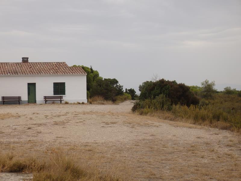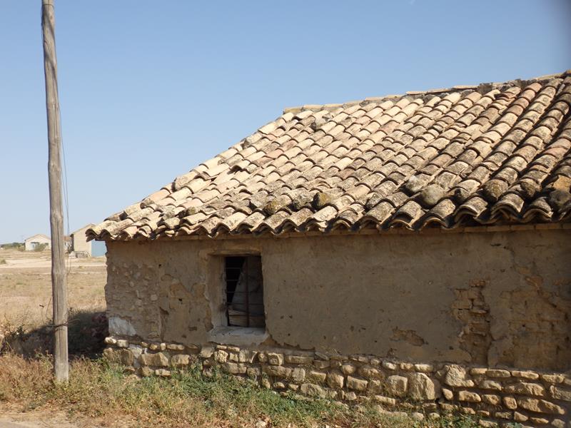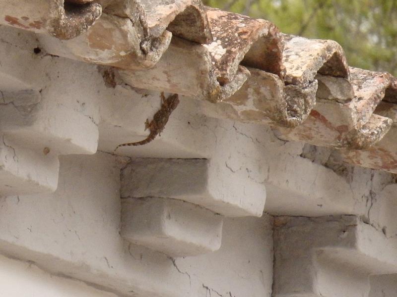 A las 15:16 horas, la pista llega hasta las proximidades de una edificación de paredes blancas, que queda a la izquierda. Me acerco a ver qué es. La puerta está cerrada. Sólo una salamandra corretea por la zona, pero enseguida vuelve a su escondite bajo las tejas.