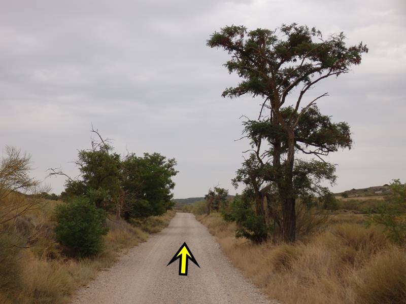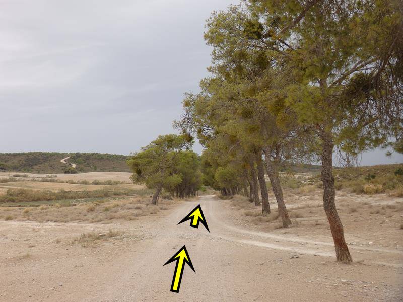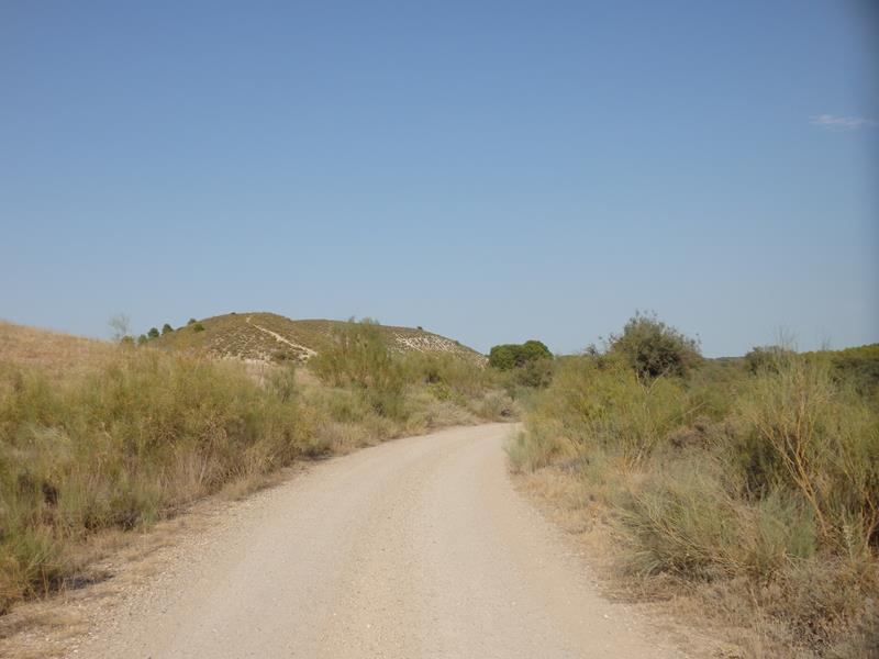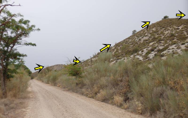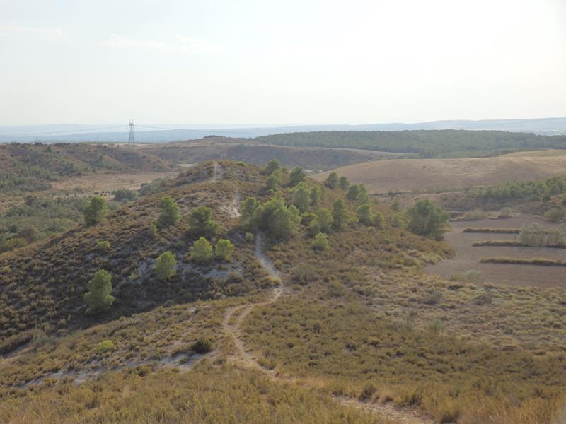 Voy avanzando y veo el montículo que superé por la parte alta y el camino que me permitió bajar (en la foto lo indico con flechas). También veo que de vez en cuando un pilote de madera me indica que voy por el CR-31, el camino rural de Zaragoza, correspondiente al monte de Peñaflor.