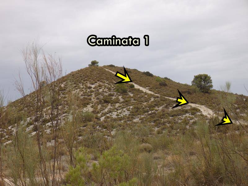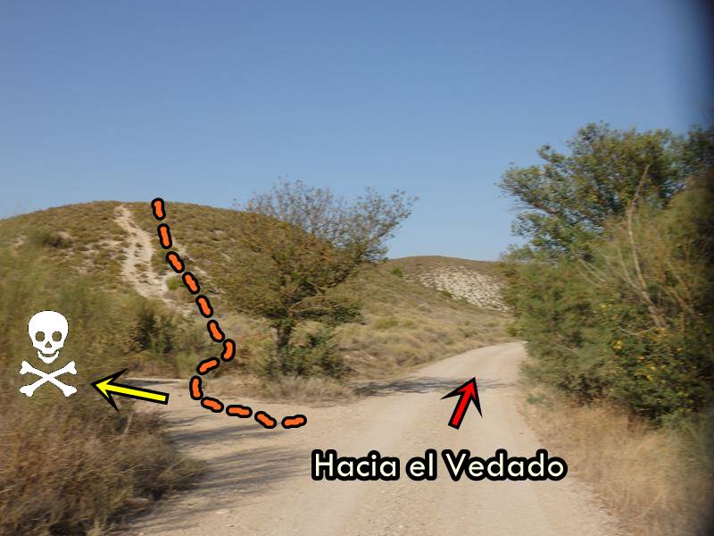 Frente a mí, por encima de la bifurcación,un montículo pelado.¿Y si lo subo y así tendré una visión más amplia del terreno? Total, hoy he venido a inspeccionar, nada más. Allá voy. En una foto que pongo debajo os marco el camino que tomé.