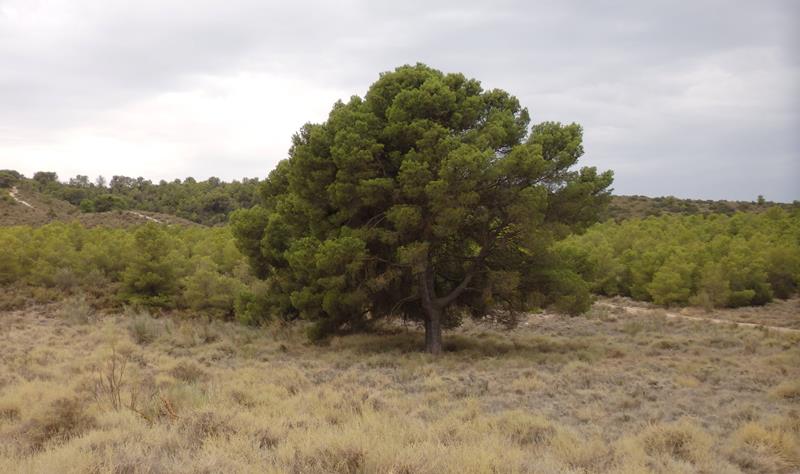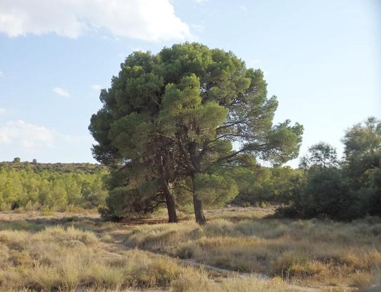 Me llama la atención, a mi izquierda y en altura, un pino solitario. Es un buen ejemplar. Tal vez un indultado de otras épocas en las que el monte seguro que se extendía mucho más, y que terminó siendo eliminado por la tala masiva y la presión humana. Afortunadamente, hoy en día se trata de conservar todo esto y si es posible aumentarlo a base de repoblaciones.