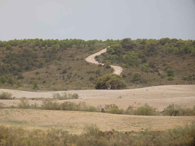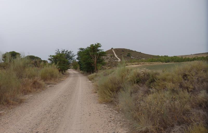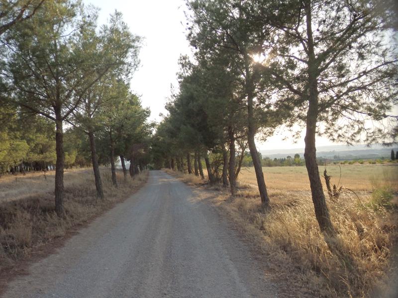 La pista sigue el perímetro de la colina, a mi izquierda,que está llena de árboles, sigo pensando que en algún momento la tendrá que rodear, supongo,para que pueda subirla. A mi derecha, observo algún árbol solitario, pero mayormente lo que veo son campos en barbecho.