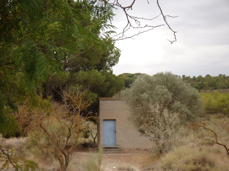 Continuando con la marcha, y rodeado de todo tipo de vegetación, a mano derecha podréis ver una especie de caseta – os la pongo en la foto- que desconozco cuál será su verdadera función, pero que espero os sirva de punto de referencia, aunque con seguir el camino todo recto basta. Tras los campos de cultivo veo una buena masa de árboles.