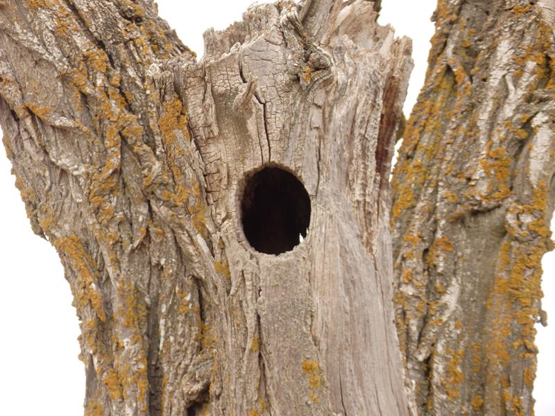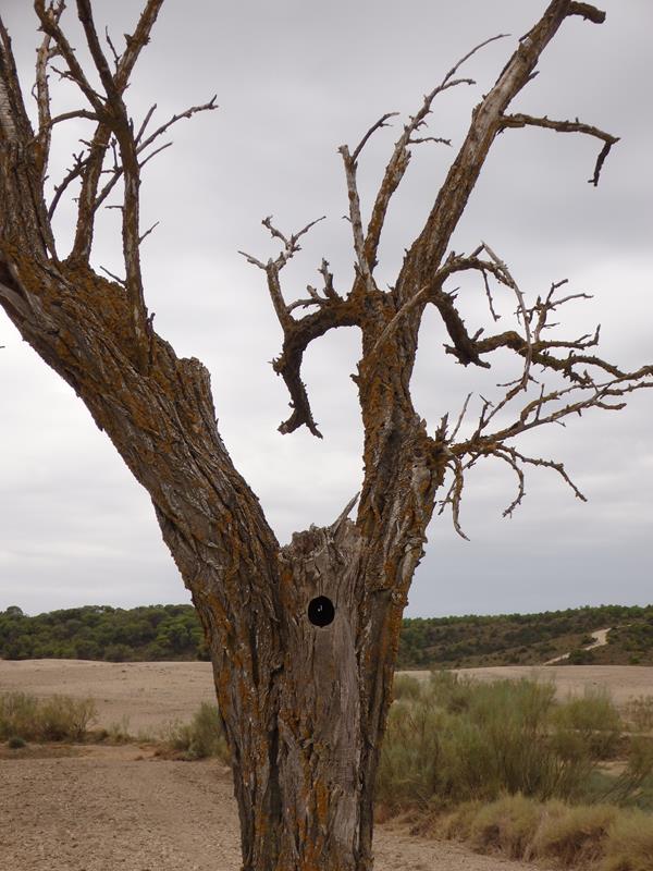 Tras un rato caminando,son las 14:52 horas, cuando a mi derecha veo un viejo árbol que está seco pero que tiene un agujero en su tronco. ¿Qué pájaro lo haría? ¿A cuántas especies habrá servido de nido?. ¿Llegarían a existir en este bosque hace muchos años pájaros carpinteros y esto es un recuerdo de otros tiempos?. No lo sé, pero el perfecto agujero sobrevive el tronco, a saber desde cuando.
