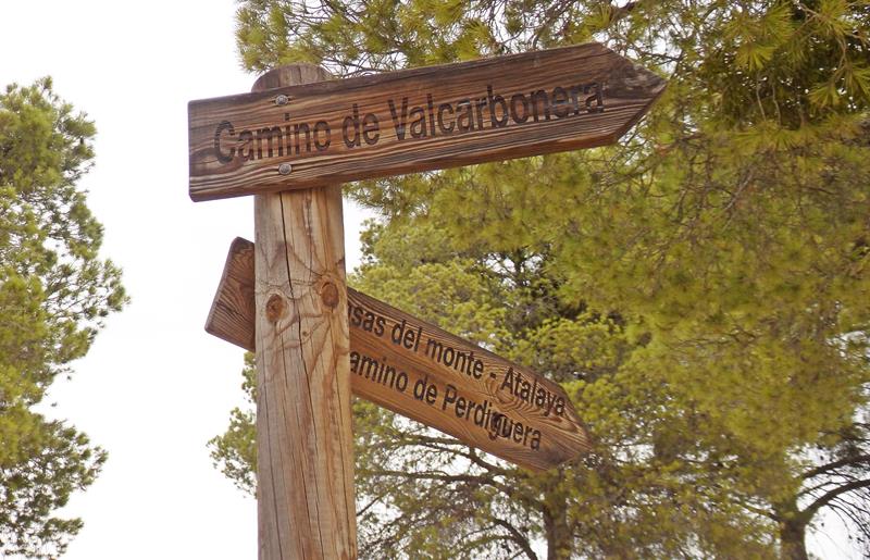 Paso al lado de un poste de madera con un par de indicaciones para ir al camino de Perdiguera y al camino de Valcarbonera, no hago caso y sigo recto. Al fondo, en el horizonte, adivino lo que parece la silueta de torre de vigilancia forestal. No he estado nunca por aquí, pero ese es mi objetivo, así que camino sin perderlo de vista.