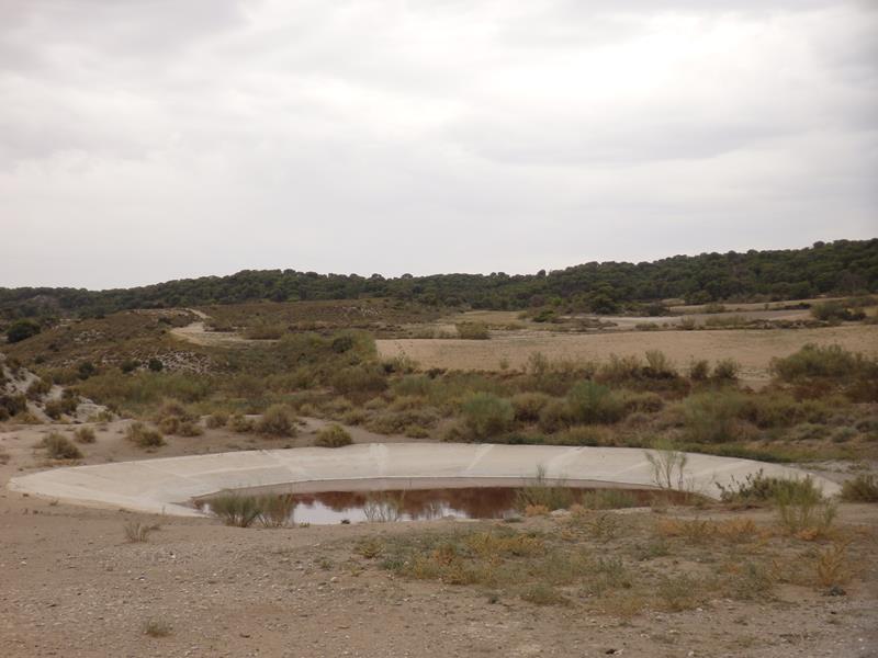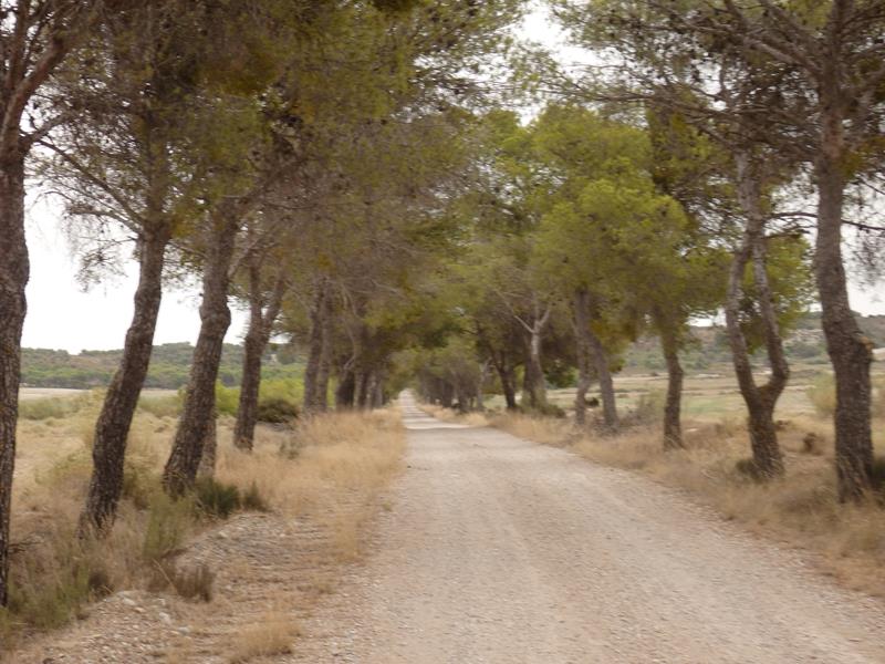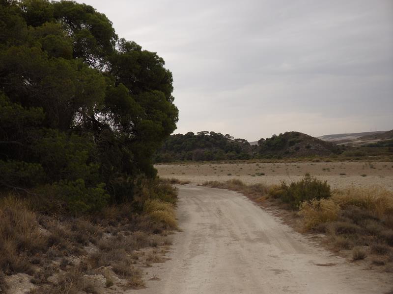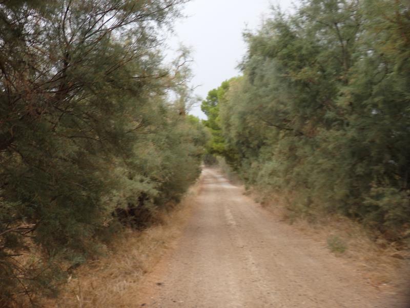 También pasado el poste de señales veo una especie de balsa artificial, a mano derecha, que imagino servirá para que beba el ganado. Esta zona tengo entendido era una antigua dehesa. En esta zona la hilera de árboles se interrumpe en parte, pero enseguida vuelve a reiniciarse. A lo lejos veo caminos bien definidos, como imitando una culebra blanquecina. A saber dónde llevarán.
