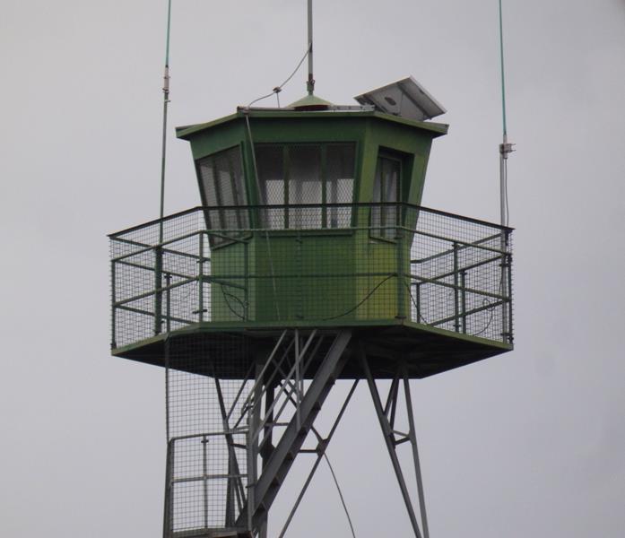Es un simple cubículo pintado de verde, con ventanales hacia todos los ángulos. Está erizado de pararrayos. Si ha de caer alguno, que lo haga sobre la torre, no sobre un árbol, así se evita un incendio.