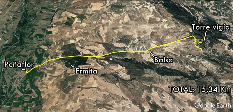 Llevo ya 14 Km recorridos y estoy llegando a la zona donde se puede uno desviar hacia la ermita.Veo a lo lejos la torre de la iglesia de Peñaflor.