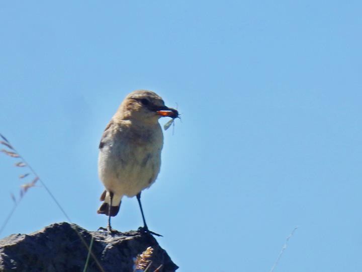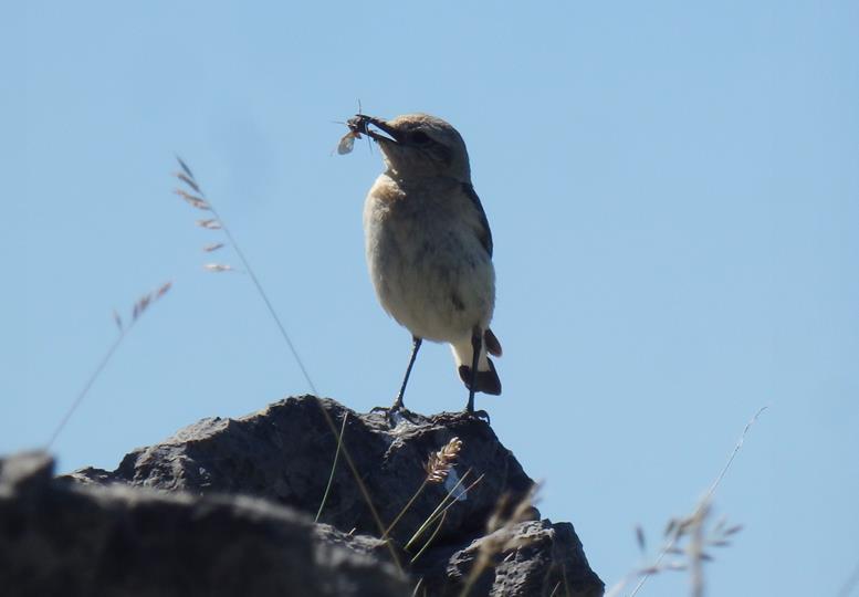 Mientras subo,donde la intermitente senda hace una curva y sobre unas rocas , un pajarillo canta alegremente.Me ve, pero no se mueve. Mira a un lado y al otro, exhibiendo su trofeo, un insecto que acaba de cazar y que lleva atrapado en su pico. La luz del sol atraviesa el abdomen del insecto que parece de color anaranjado. He podido hacerle fotos antes de que se eche de nuevo a volar.