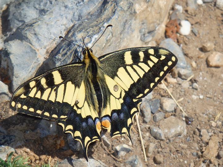 Pero no todos son picos, un buitre surca las alturas y una preciosa mariposa Papilio Machaon, o Macaón, se posa a mis pies, lo que aprovecho para hacerle una foto.