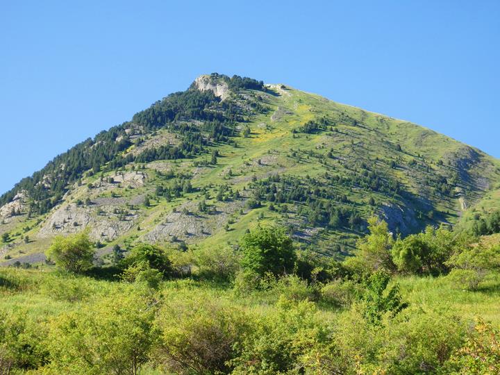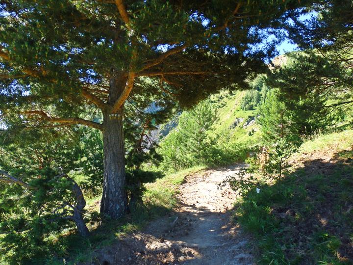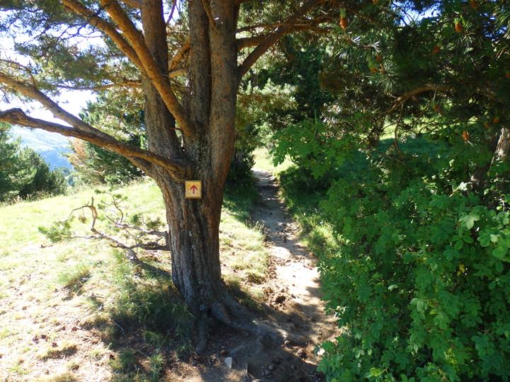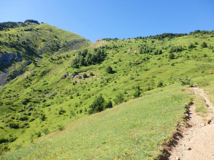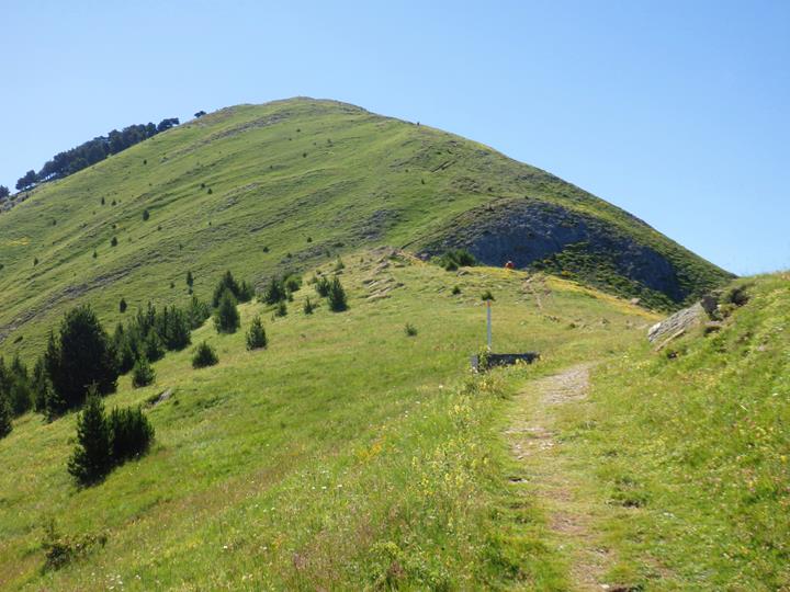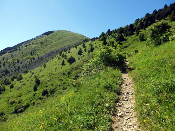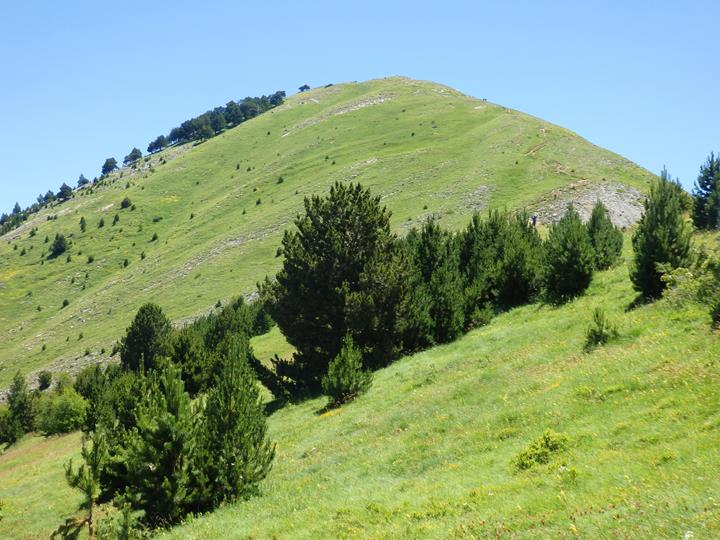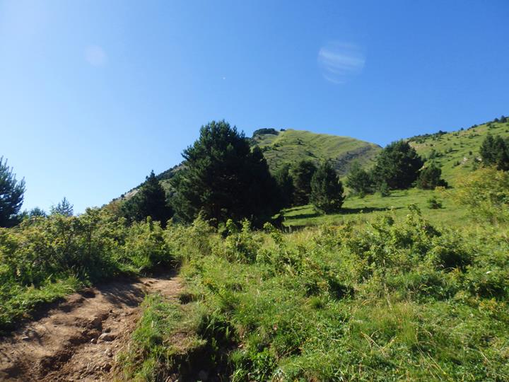 Ahora ya veo claramente el lomo del Pico Pacino. La senda sigue ascendiendo entre prados y pinos negros aislados.