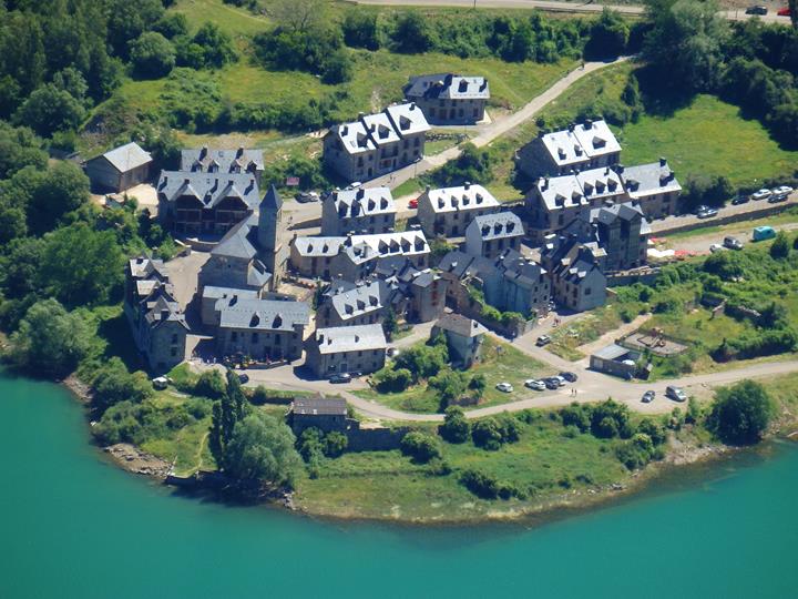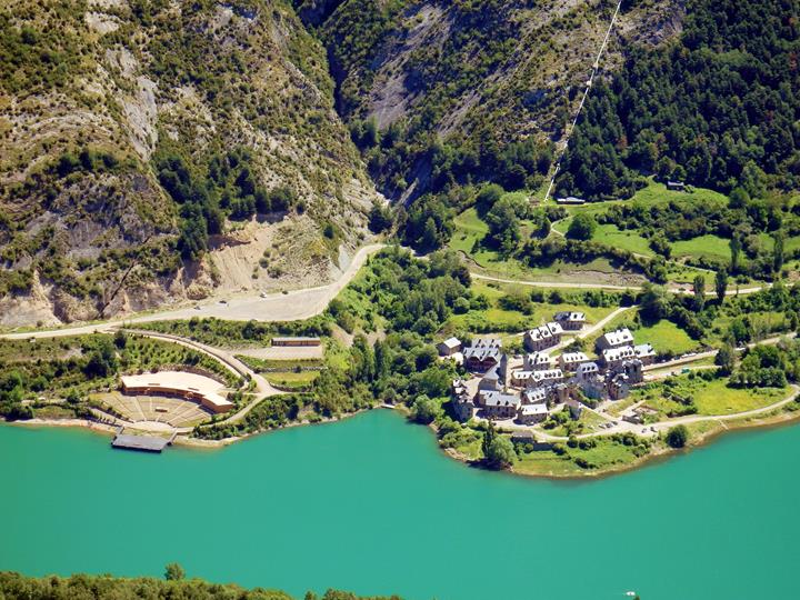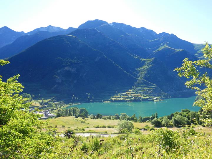 Hacia el este, el Pantano de Lanuza, con el pueblo del mismo nombre. Lo he recorrido entero, pero desde aquí arriba parecen cuatro casitas de nada. También se aprecia el anfiteatro construido para celebrar los festivales veraniegos de música de Pirineos Sur.