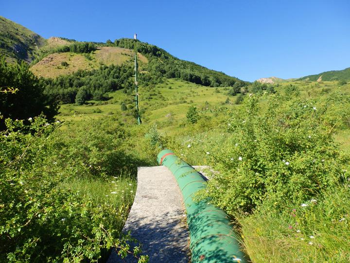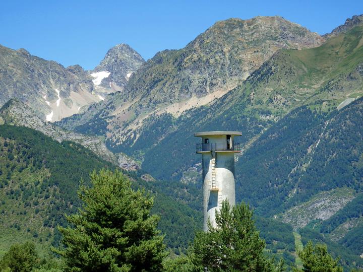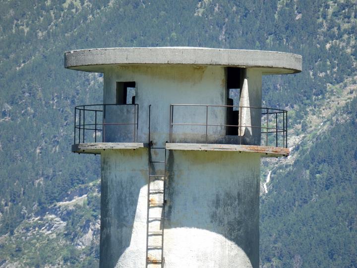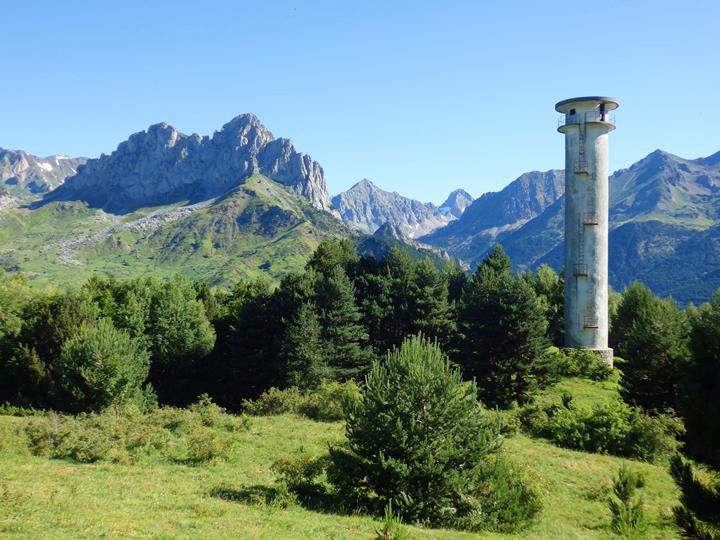 La senda ha ido ganando altura progresivamente, y en la zona de pastos, a mano izquierda entre los árboles,se ve perfectamente la torre de descompresión de aguas perteneciente a la conducción que conecta el embalse de Escarra con la estación hidroeléctrica de Sallent de Gállego. Estamos a unos 1.600 metros de altura.