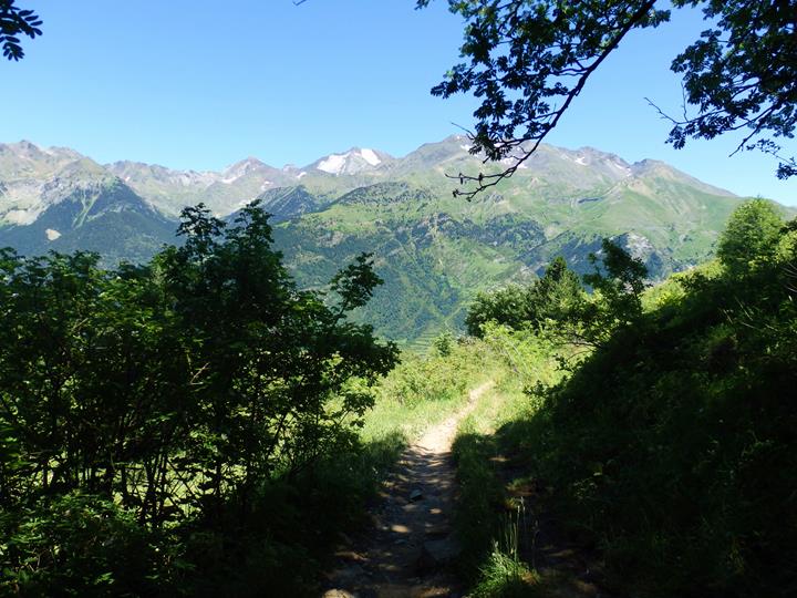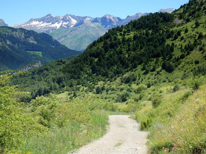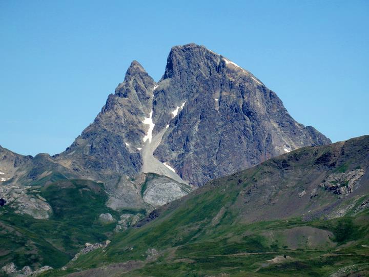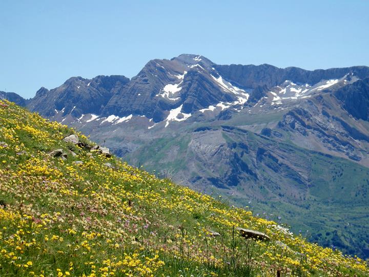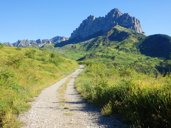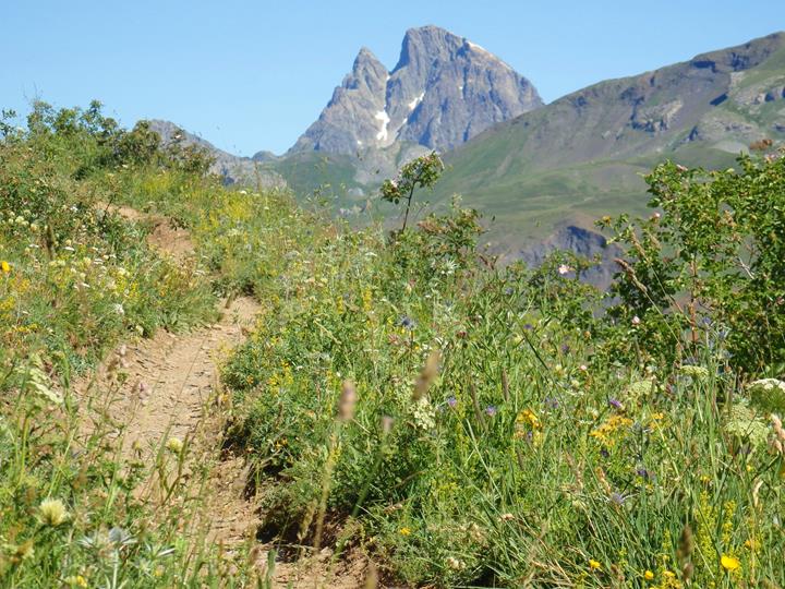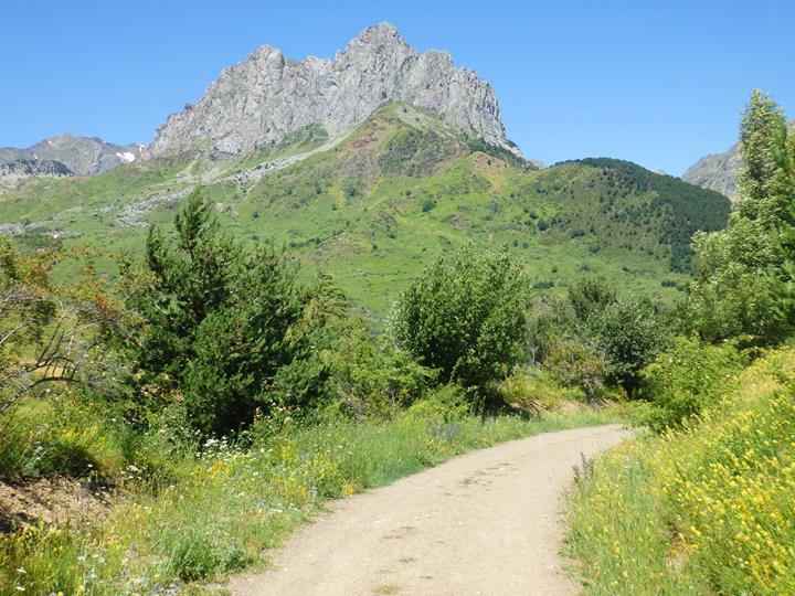 Como el PR va haciendo zigzag para subir de forma progresiva la ladera, hay veces que se ve al frente el Midi D´Ossau (2.884 m), ya en territorio francés, una mole en forma de chimenea petrificada y erosionada de lo que fue un potente volcán hace 200 millones de años. Hablo de él y de su gemelo, el Anayet, también un volcán de esa época en la entrada de este blog sobre los Ibones del Anayet.