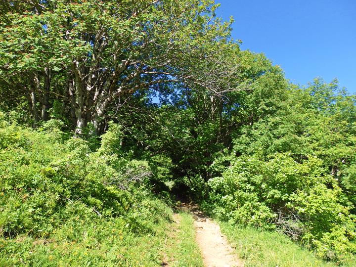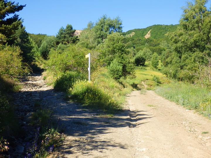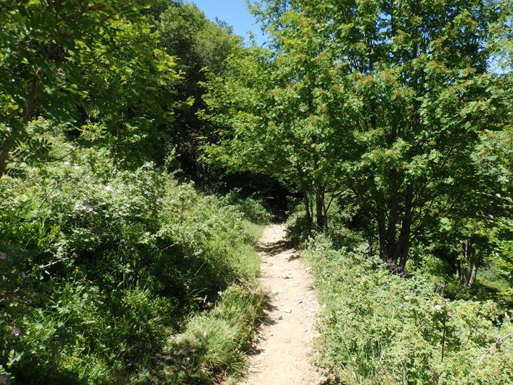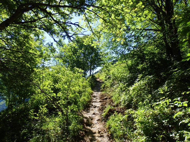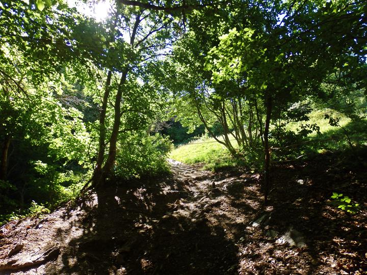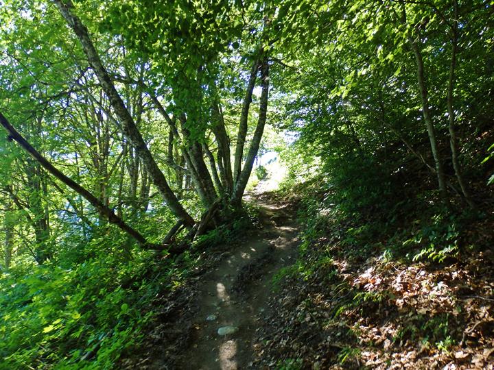 A los 1,96 km la senda deja los empinados prados y volvemos a introducirnos en una zona de árboles.Es un bosque mixto, pero más reducido que el anterior y se recorre mucho antes, viene bien para caminar un rato entre la agradable sombra que nos proporciona la abundante vegetación.