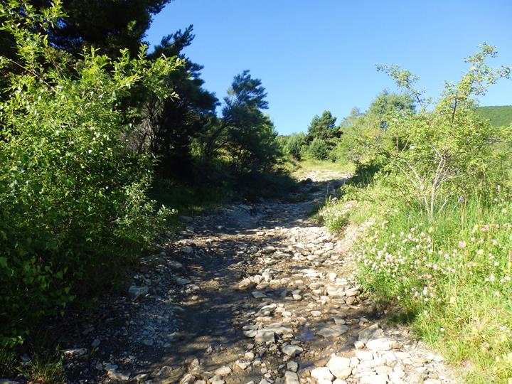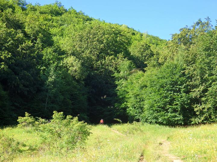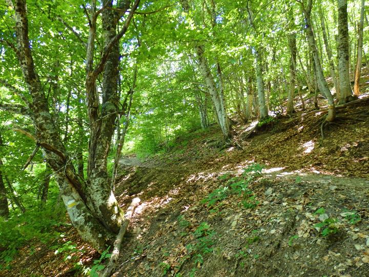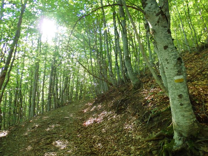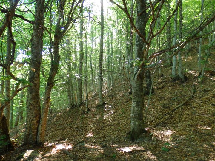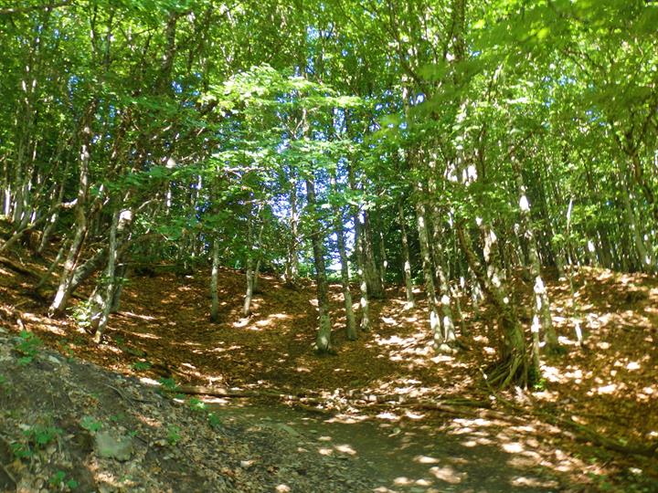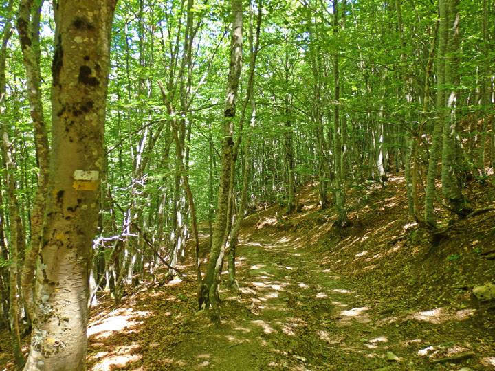 Al principio es como penetrar en un túnel, no da el sol y está todo muy sombrío, además se nota el descenso de temperatura.Es un bonito bosque de hayas. La pista, bastante ancha va siempre en ascenso. Las marcas del PR están pintadas en algunos troncos, no hay pérdida.