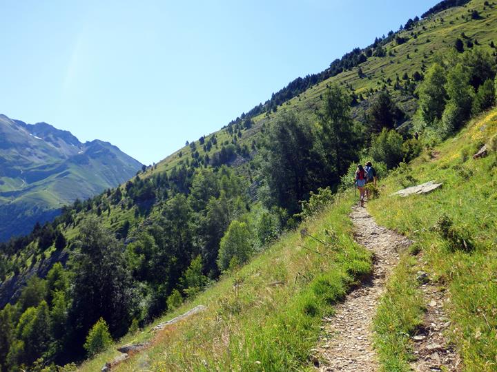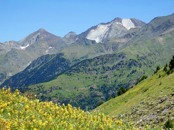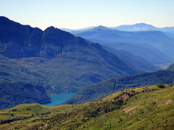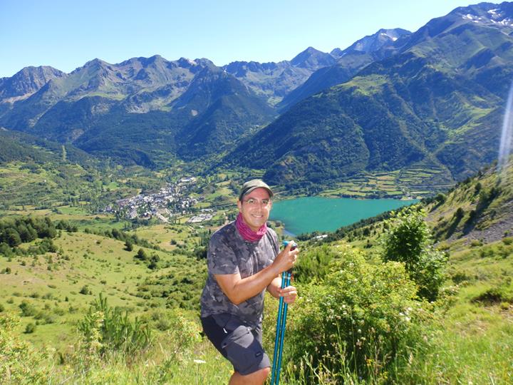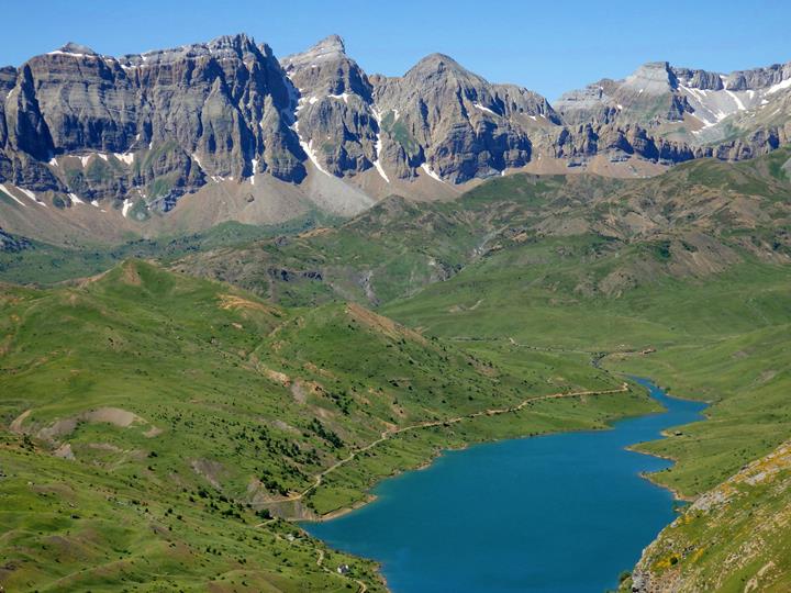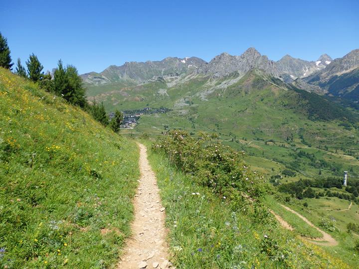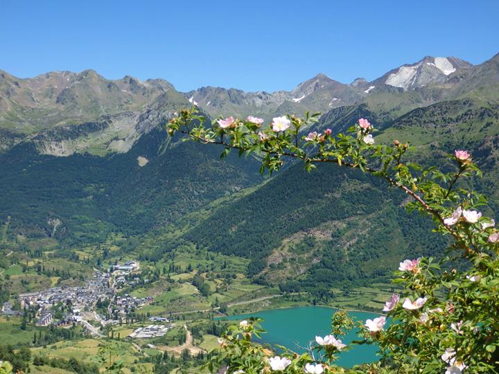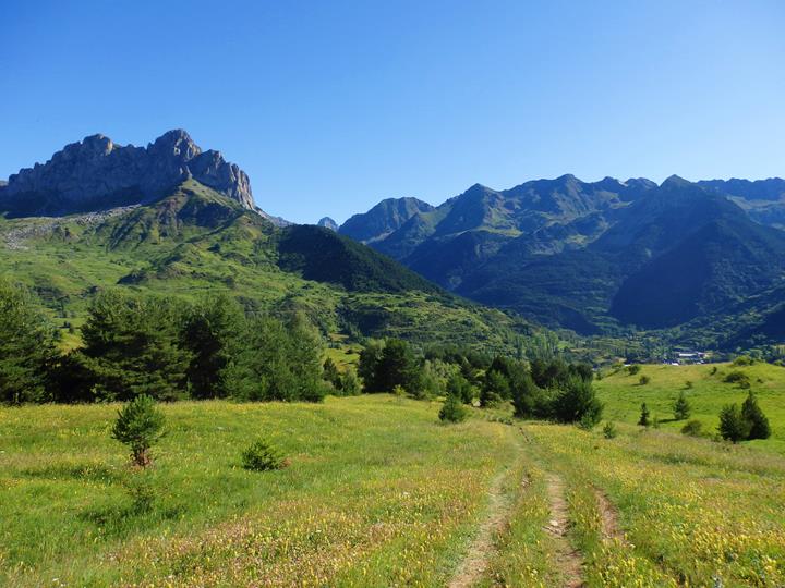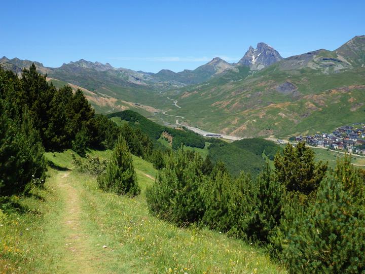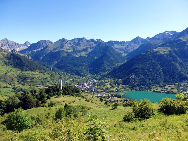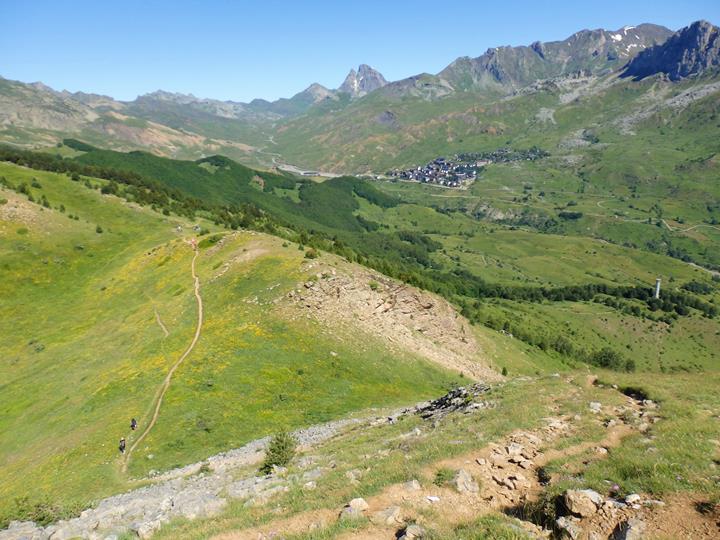 Voy por la ladera de la montaña, entre suaves prados en pendiente, siempre ascendiendo y las vistas son impresionantes. Se ve Sallent allá abajo,de un color gris claro, por el tono de los tejados de la mayoría de las casas, que son de pizarra, y también el pantano de Lanuza y todos los picos que lo rodean.