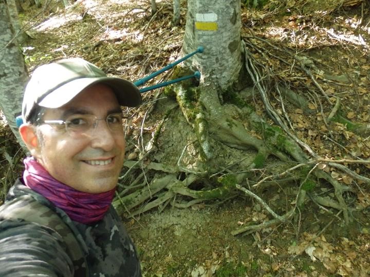 El bosque de hayas del que vengo y al fondo ese pico solitario muy puntiagudo a la derecha de mi cabeza que es el Anayet.