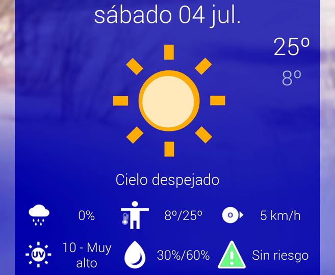 Ha sido una buena mañana de excursión. El tiempo me ha acompañado, y como véis por la foto de AEMET, 25 grados de máxima y 8 de mínima.