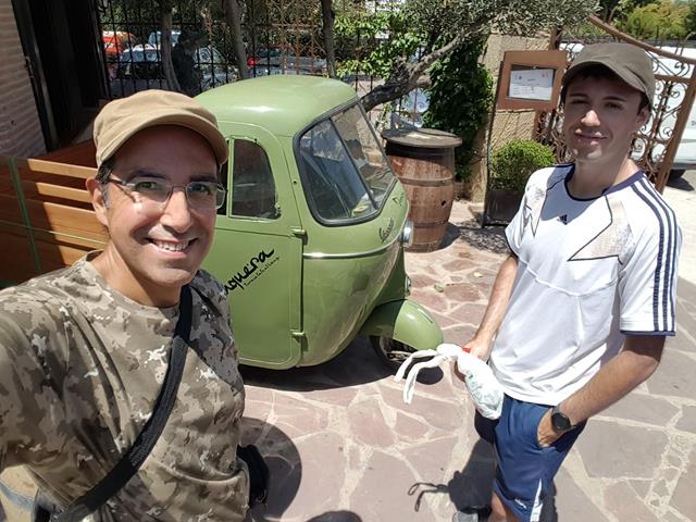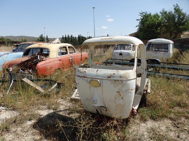 También se ve una motocarro Piaggio Ape (abeja en italiano) de 1956-1967, el modelo Ape C con motor de 150cc con cabina y con el faro en el frontal y apertura de puertas hacia delante o hacia atrás. Antes en la Fuente de la Junquera vimos otro, pero este estaba completo y bien restaurado. Al de la foto le faltan un montón de cosas, incluida la parte de la rueda delantera.
