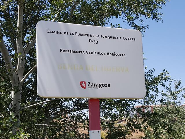 Dejando el merendero a la izquierda, seguimos caminando y enseguida te topas con una pista de tierra que es el camino de la Fuente de la Junquera a Cuarte, el D-33. Se va por ahí. También podemos ver un cartel bien grande que habla de la Fuente de la Teja, al lado del Huerva.