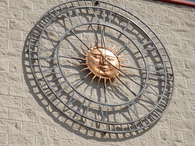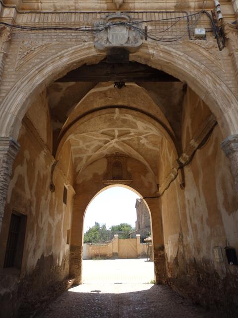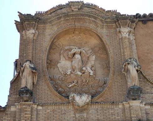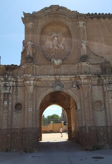 Lo primero que ves es una gran entrada de ladrillo en forma de arco de medio punto, decorada, sobre la que hay un segundo cuerpo con relieve en yeso enmarcado por un óvalo con la imagen de lo que parece un Santo o tal vez la Virgen María, y a cada lado otros dos. Por desgracia todo el conjunto está decapitado. La puerta lleva en una cartela la fecha de 1797 y está flanqueada por pilastras corintias.
