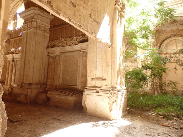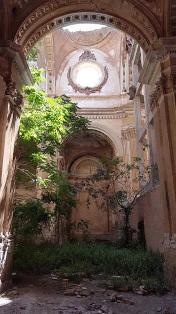 Con cuidado te puedes acercar e investigar un poco por los alrededores. Mirando a través de una puerta, pues el acceso está prohibido, se puede observar como la techumbre está caída en algunas zonas y la vegetación ha invadido el interior. Es una pena que los propietarios, que son particulares, no inviertan recursos en conservarlo. De todas formas, sí que se ha realizado alguna actuación en él, ya que la zona de la cúpula presenta como se puede ver en la foto, una estructura de hormigón a modo de refuerzo para evitar su colapso.