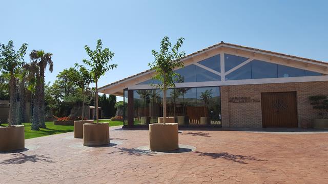 Tras atravesar la entrada, se accede a una placeta donde vemos una estructura abierta con un techumbre de tejas y desde donde se puede contemplar el edificio. El entorno está cuidado, y eso sí, y muy limpio. Aquí se nota que ha habido actuaciones municipales. Bajo esta estructura han colocado algunos paneles explicativos sobre la historia del edificio.