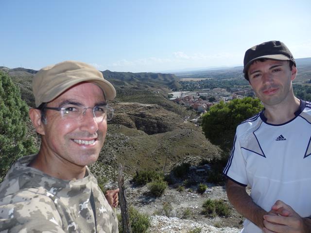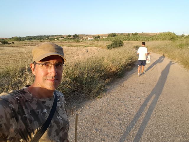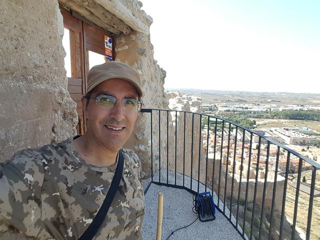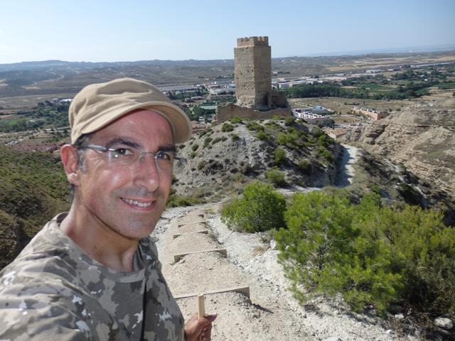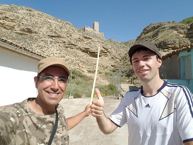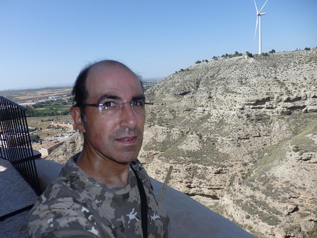 Casi a la misma altura que el castillo, al menos aparentemente, pues luego veremos que no es así, está el aerogenerador que aparece a nuestra izquierda. Ahora descansamos un rato a la sombra, pues el calor es insoportable y sudamos por todos los poros. Yo estoy ya un poco agobiado, como puede verse en la foto de debajo por mi cara, me quito la gorra, dejo que me de el aire en la cabeza y me vuelvo a hidratar bien. Soy resistente, pero cuarenta grados en la estepa zaragozana no es un plato apto para todos los gustos.