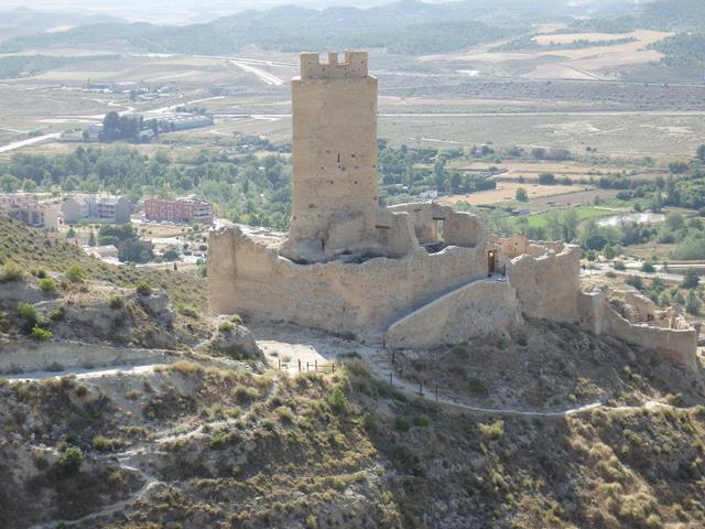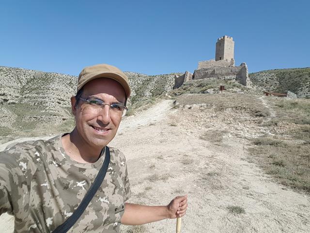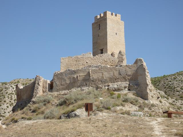 Y por fin llegamos al castillo tras 17 km de caminata. El castillo se encuentra a unos 380 m sobre el nivel del mar y a unos 80 m sobre la llanura del valle del Huerva. La erosión de dos barranqueras por los lados E y O, que confluyen al llegar al nivel del río, convierten el cabezo en un apéndice de la sierra, rodeado por sus ¾ partes de acantilados de 70 m de altura, aunque relativamente accesible por el lado S.