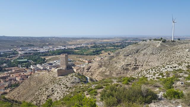 Desde aquí arriba se puede contemplar una parte de la vega del río Huerva y si estuviera más despejado, se verían los montes de Juslibol y la propia Zaragoza y hasta los Pirineos, pero el día está brumoso. Tengo en el objetivo de la cámara el castillo y el aerogenerador en el mismo plano. Como podéis ver, estamos haciendo una U por la parte alta para salvar el barranco.