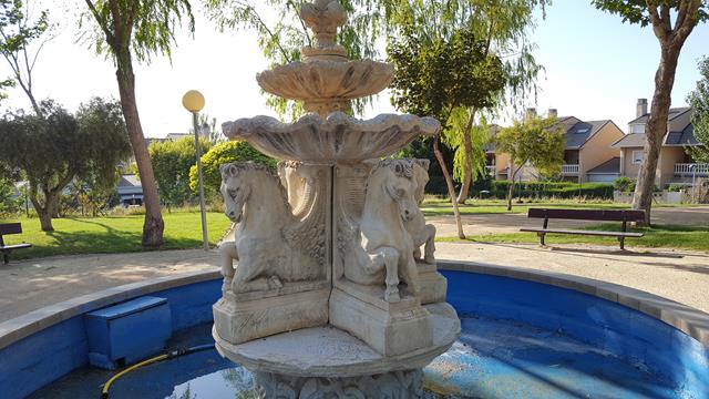 Cuando dejamos esta zona, volvemos a encontrarnos con urbanizaciones y con un entorno más amable. Incluso con alguna fuente. Una bonita plaza en la que hay una fuente ornamental con las figuras de unos caballos, nos da algún momento de sombra y de respiro.