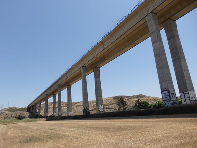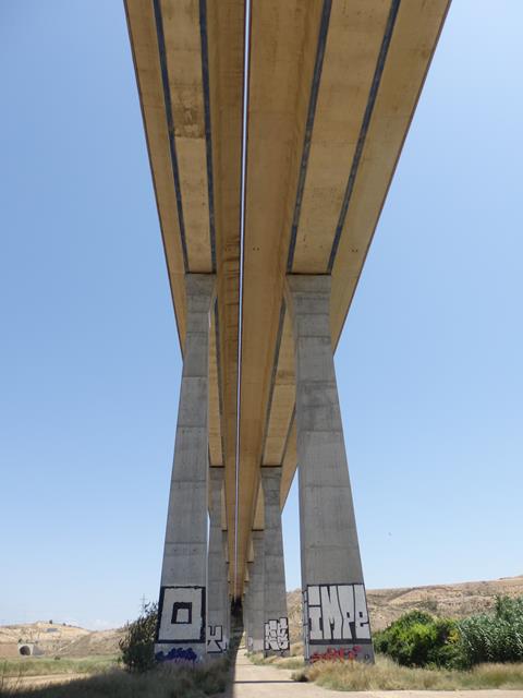 Después el camino sigue y pasas por debajo del puente del AVE, una estructura enorme vista desde abajo. Entró en servicio en octubre de 2003, y los pilares miden 50 metros de altura.