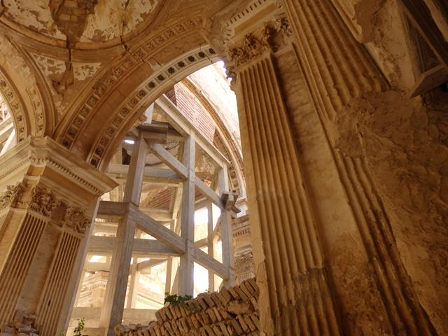 Hay que recorrer algunos metros más por una calle a la derecha de la placeta para poder contemplar el edificio de cerca. La brillante luz del sol atraviesa unos enormes ventanales redondos, esto no debería ser así, y lo único que nos demuestra es que toda la cubierta superior está arruinada, teniendo el templo como único techo el cielo.