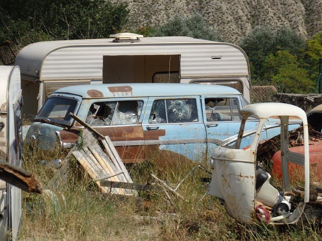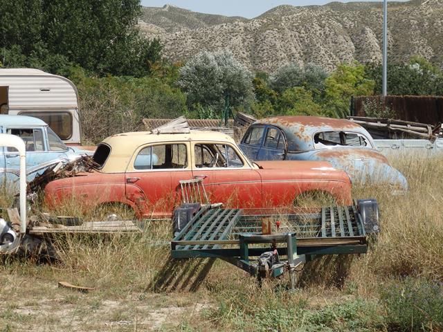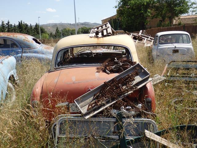 Justo al lado del muro, frente a la entrada lateral, en una explanada vallada, descubrimos un montón de coches clásicos descansando al sol. ¡Vaya sorpresa!.No sé de quién será esto, pero tiene una buena colección. Lo malo es que están a la intemperie. Una parte de la valla perimetral está caída lo que me permite ver mejor todo lo que hay ahí.