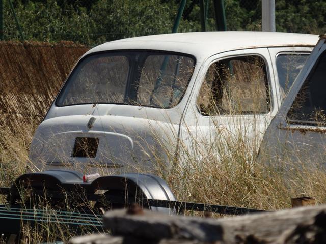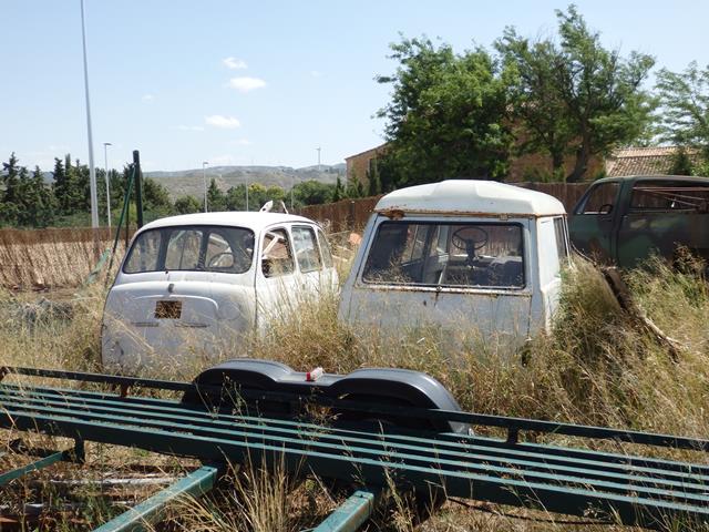 Entre la vegetación veo también lo que parece un Seat 600 estirado, la delantera es chata,con dos puertas, es un Fiat 600 Multipla del año 1955. En su día llamaba la atención por muchas cosas. Era un vehículo con cuatro puertas: dos traseras y dos delanteras que se abrían al contrario.